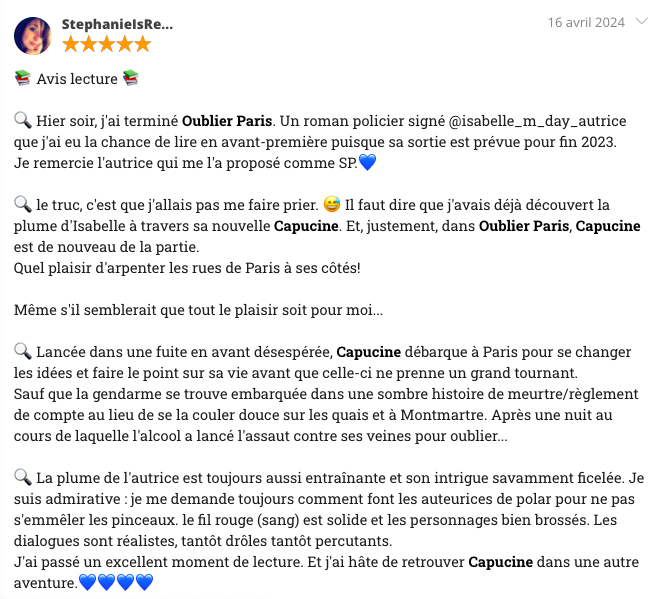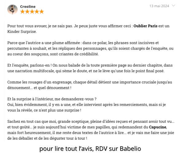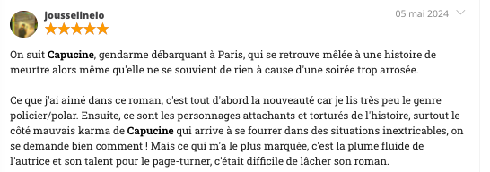 Août 2010. Au cœur de la nuit parisienne, Claude Forestier, éminent commissaire au 36 Quai des Orfèvres, est assassiné. Le lendemain, la gendarme Capucine Colin est convoquée au commissariat. Elle est l’une des dernières à avoir vu le flic. Le problème, c’est qu’elle ne s’en souvient plus. Alors qu’elle était justement venue sur la capitale pour oublier ses tourments, elle va devoir composer avec les imprévus et ses mauvais choix. Jusqu’où devra-t-elle aller pour prouver son innocence ?